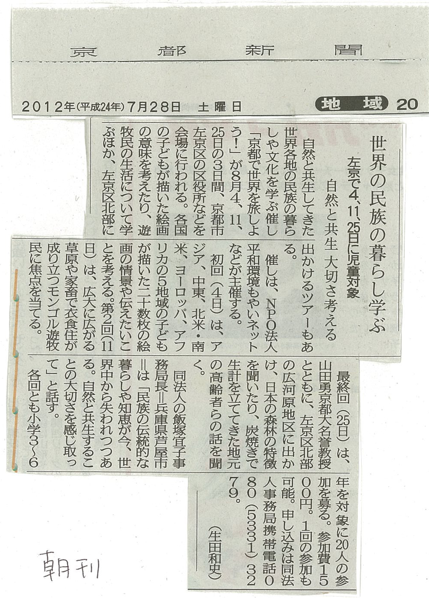 おはようございます☆ 先月開催しましたもやい初の事業! もやい環境ワークショップ サマースクール 『京都で世界を旅しよう』 地球たんけんたい2012 ご好評のうちに終了しました! ご参加頂いた皆さまありがとうございました。 また、3回のワークショップの各回で、 子供達にたくさんの大切なことを伝えてくださった、 古川先生、山田先生、阿部先生、 そして、 スタッフとしてお手伝いくださった みなさま、 今後ともよろしくお願いします。 サマースクールの様子が、 新聞掲載されておりますので、 お知らせします(✧≖‿ゝ≖) 今後もさらに発展させて、 事業を続けていきますので、 みなさまどうぞよろしくお願いいたします。 事務局 タマでした ![]() PR おそくなりましたー。