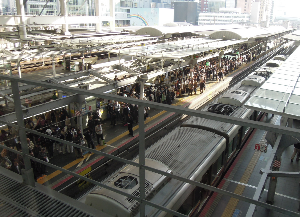 で、大阪駅。 電車待ちの人で、ホームが埋め尽くされている。