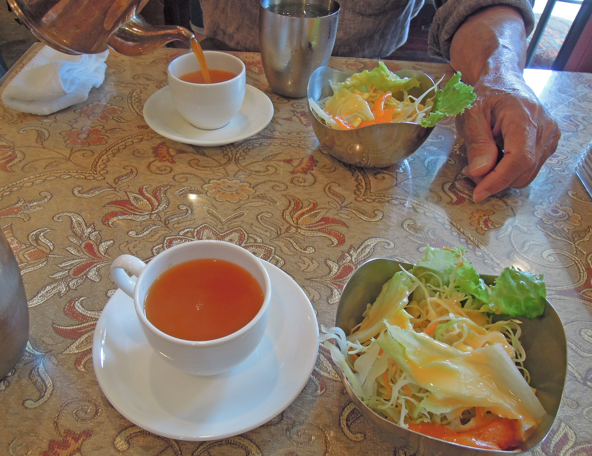まずはサラダと、人参のスパイシースープ。